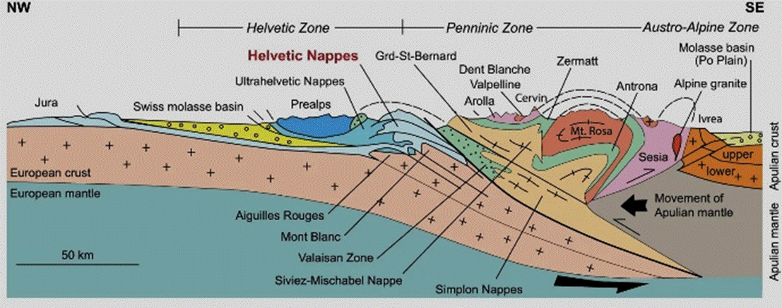 由于欧洲板块中的一些薄弱带,以及洋壳和陆壳的密度差异,非洲板块楔入到欧洲板块的洋壳与陆壳之间,形成犬牙构造,这也是阿尔卑斯造山带与祁连造山带一个很大的不同。欧洲板块的下部继续俯冲,上部改为仰冲,并将洋壳物质带出地表,这些物质共同经历复杂的变质变形作用并呈现在我们面前。