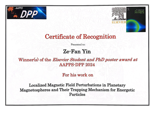 空间物理与应用技术研究所博士研究生尹泽藩做邀请报告,并展示了题为“Localized Magnetic Field Perturbations in Planetary Magnetospheres and Their Trapping Mechanism for Energetic Particles”的海报,荣获大会爱思唯尔青年海报奖。该奖项由国际著名科学文献出版社爱思唯尔(Elsevier)资助设立,每年从被提名的博士生或博士毕业两年内的青年科学家中遴选出两名获奖者。