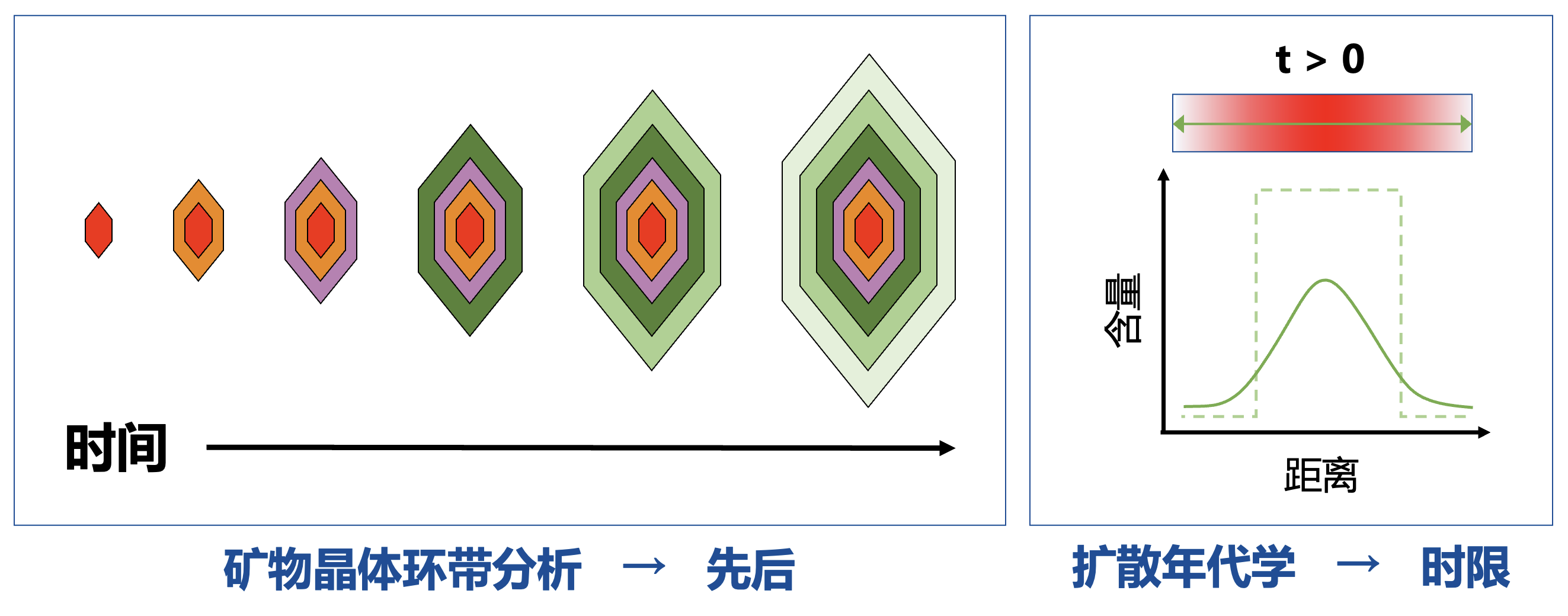 矿物是地球演化过程的亲历者与记录者,蕴藏着丰富的信息等待解译。基于微区分析技术、通过空间换取时间的思路,对矿物晶体由核到边开展氧等同位素分析,再通过扩散年代学约束时间,李扬与合作者建立起地质过程高时间分辨率解析技术体系(图1)。该技术具有广阔的应用前景,李扬副教授与合作者在该领域开展了系列创新性研究,如通过石英和锡石等矿物约束成矿作用的时间和节律、探究高原隆升的机制等。这些研究得到国内外同行的广泛关注和认可,作为地质年代学和矿床地球化学领域活跃的青年学者,应Nature Geoscience邀请,李扬副教授以石英这一广泛存在的矿物为例,为“All minerals considered”专栏撰写论文,讲述石英参与并记录的地球演化历史、早期产氧过程和成矿作用等,以及作为人类祖先赖以生存的工具和现代科技领域重要原材料,服务于人类创新发展的故事。