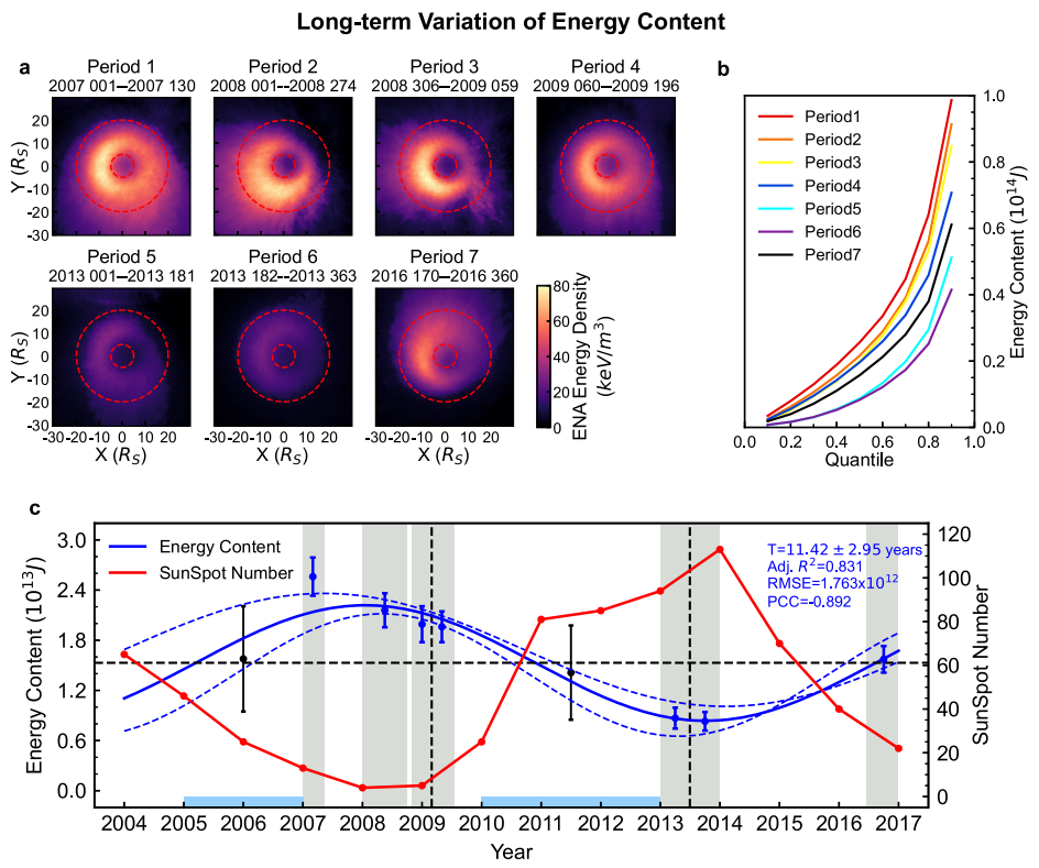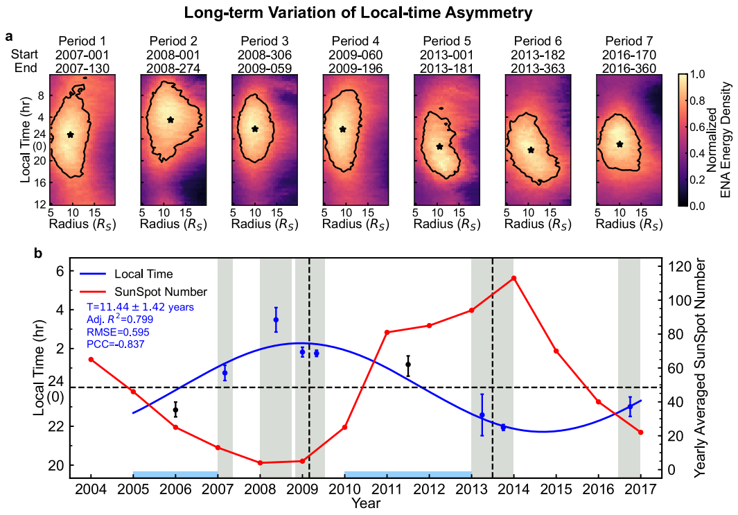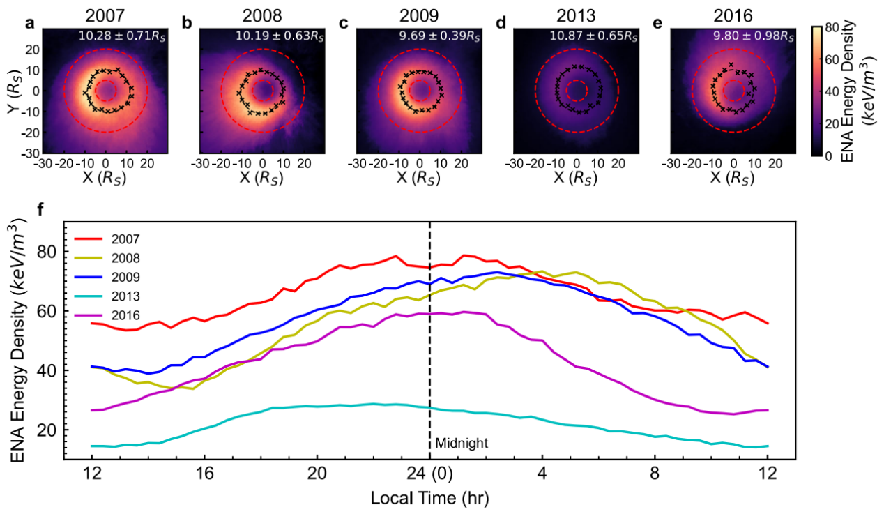 性爱影片 空间物理与应用技术研究所乐超研究员课题组利用土星探测卫星卡西尼号(Cassini)上搭载的能量中性原子成像仪研究了土星环电流的长期分布特征,发现由超热等离子体(~24-230 keV)贡献的环电流成分在空间分布和强度上存在近11年的长周期变化,并将这种变化与太阳活动周期相关联,提出太阳活动周期调制土星磁层中等离子体加速与输运过程的可能性。相关成果于近期发表于学术期刊《自然·通讯》(Nature Communications)。