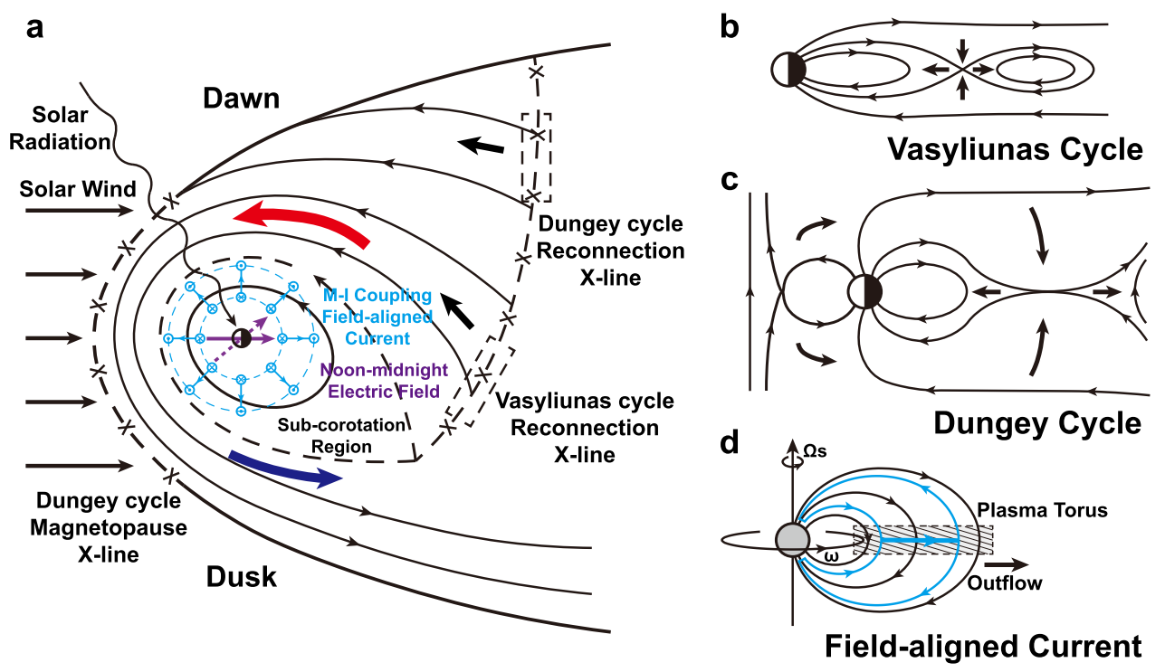 研究结果表明太阳活动可能调制土星磁层等离子体加速与输运过程。一方面太阳风压缩土星磁层,日侧磁层顶与行星际磁场重联引起的磁尾重联和等离子体注入(Dungey cycle),与土星自转驱动的磁尾重联和等离子体注入(Vasyliunas cycle)过程相互作用,可能引起环电流地方时分布不对称性的变化;另一方面太阳辐射可以影响土星电离层电导率,并通过共转驱动的场向电流影响磁层中的磁通量管交换过程,从而调制环电流超热等离子体的加热(图4)。此外,类似的长周期变化也存在于土星辐射带和正午-午夜电场中,说明太阳活动的调制可能更广泛地存在于土星磁层中。本研究为太阳活动调制气态巨行星磁层提供了新的视角,并期待能通过未来的木星探测卫星(JUICE)搭载的ENA成像仪展开更进一步的研究。