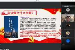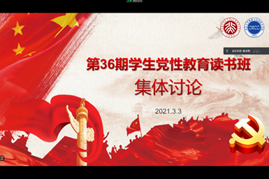 第36期党性教育读书班线上集体讨论活动于2021年3月3日下午2点在腾讯会议平台上举行,讨论围绕“学党史、知党情、守党纪、悟思想的时代价值”、“牢记使命初心,决胜脱贫攻坚”、“疫情下党员的先锋本色和家国情怀”、“大学生党员的成长与担当”、“新时代地学青年党员的专业价值和使命初心”五个主题展开。读书班50名学员进行了小组讨论成果分享,读书班领队姜卓君主持了本次会议,读书班负责人、学院党委副书记王一涵老师参与了本次讨论。