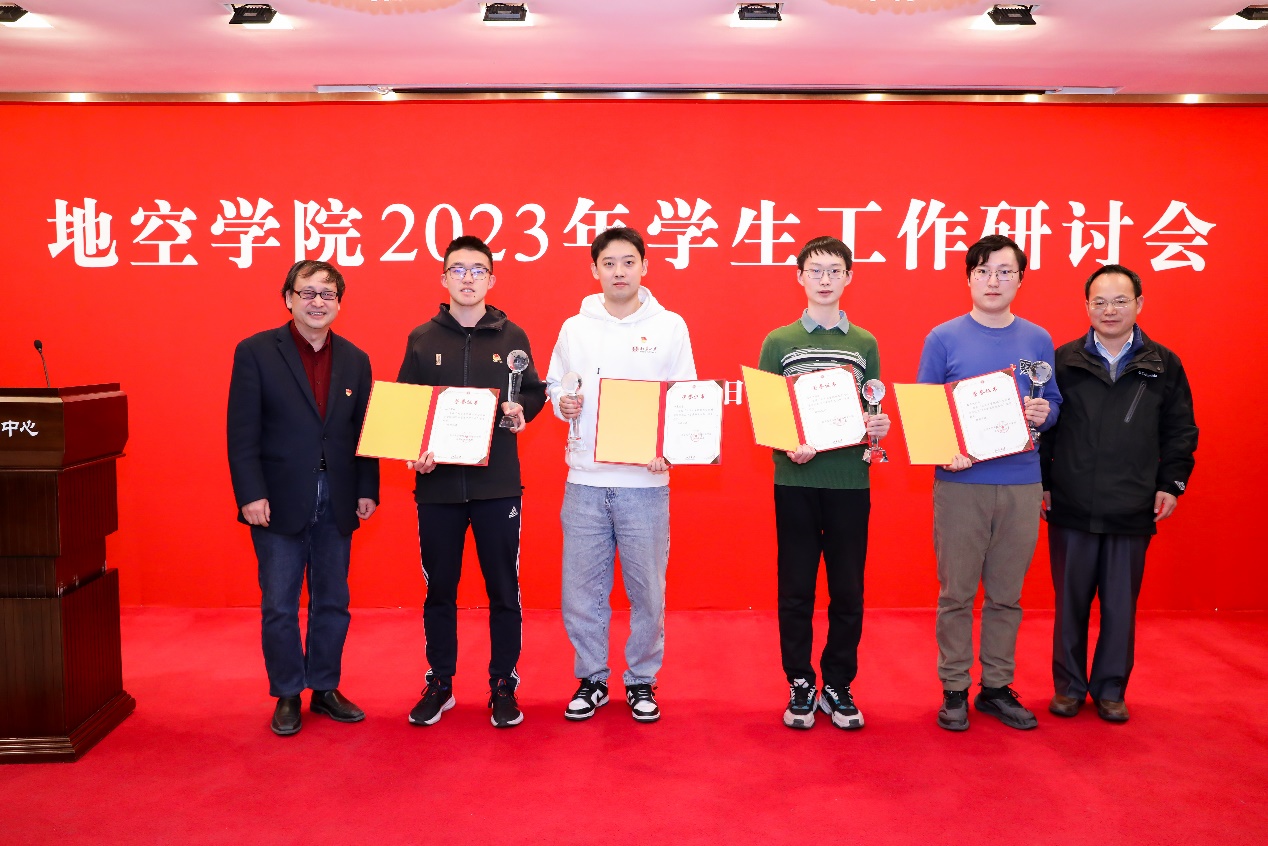 2022年学生年度人物”的五位同学和一个集体进行表彰,宁杰远、江大勇对到场的获奖者进行颁奖。