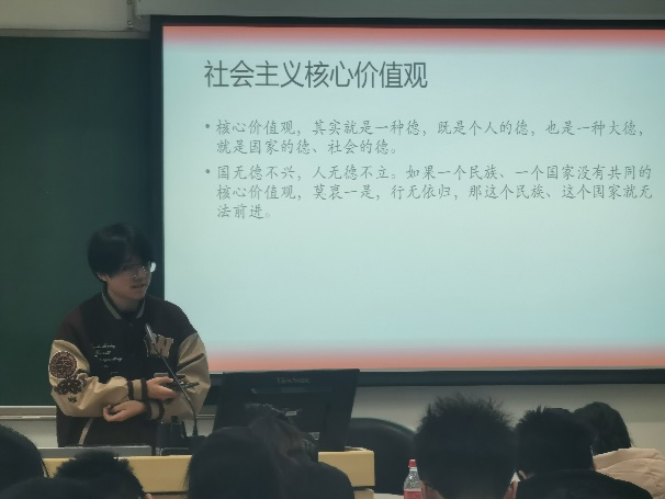 师生座谈会上的讲话《青年要自觉践行社会主义核心价值观》具体内容,联系习近平总书记在纪念五四运动100周年大会上的讲话和其他相关内容,带领大家深入学习了五四精神和社会主义核心价值观具体内涵,并结合四书中相关内容阐释了古今核心价值观的异同,帮助同学们从中汲取养分,实现精神层面的成长。