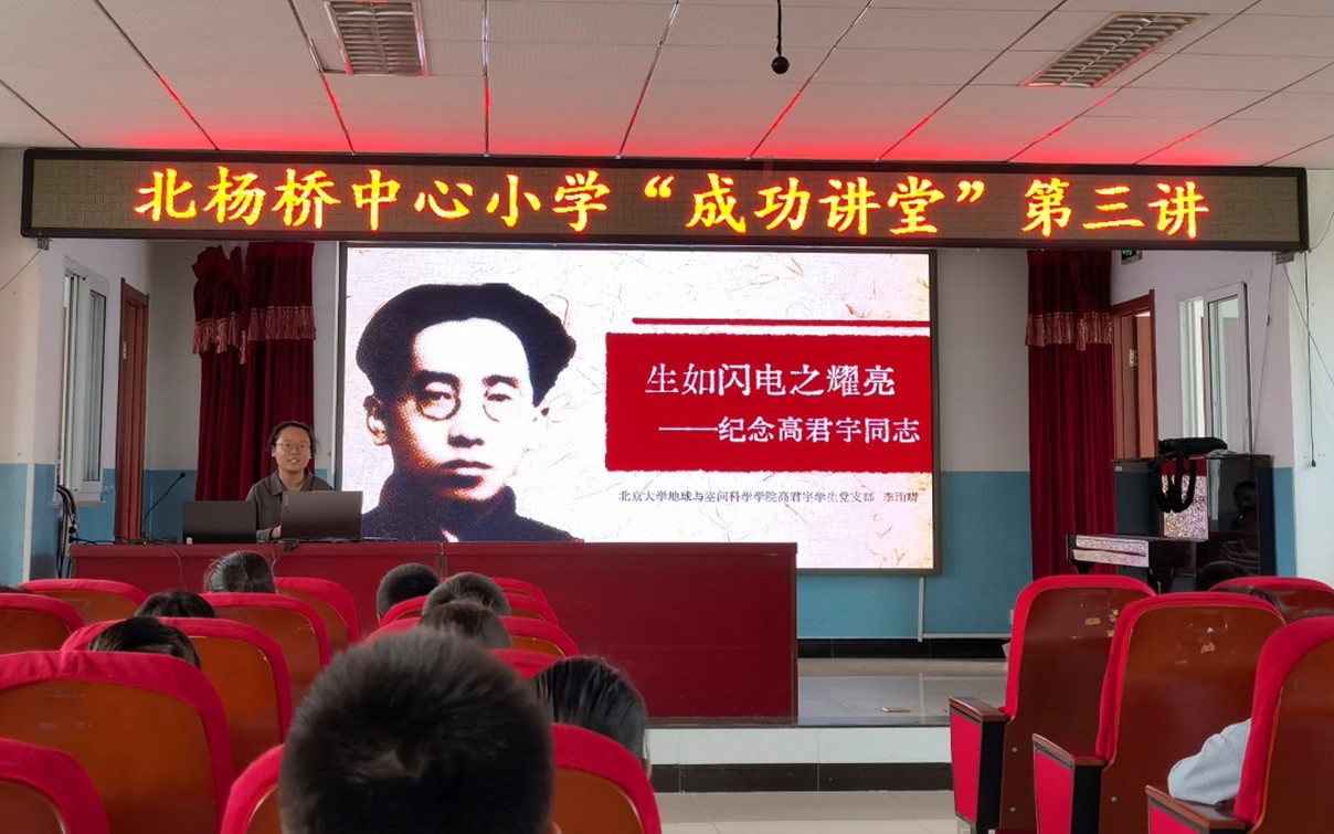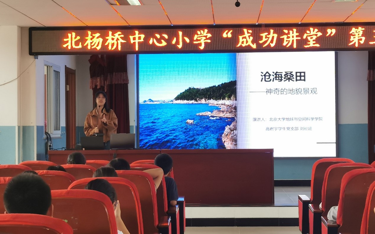 座谈会后,同学们来到北杨桥中心小学的“成功讲堂”,来自李四光讲师团的李雨晴和刘祉延同志为这里的小学生们带来了两场精彩的宣讲。李雨晴以“生如闪电之耀亮——纪念高君宇同志”为主题,介绍了毕业于北大地质系的学长,中国共产党和中国共产主义青年团的早期领导人之一的高君宇同志一生纵横南北,为传播马克思主义、发展壮大党的组织、领导工人运动做出重大贡献的光辉人生,大力弘扬了高君宇的革命信念和爱国主义情怀;刘祉延从神奇的自然景观引入,通过介绍地球表面丰富多样的地貌形态及其背后的抬升与侵蚀作用,生动地阐释了“沧海桑田”这个成语的含义,让小朋友们感受到了大自然塑造地表的神奇而磅礴的力量,为孩子们认识、了解地球科学打开了一扇窗户。