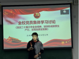 团委博士生讲师团代表徐静同志结合关键词“新质生产力”做《向新而行,质变未来——新时代青年的使命与担当》的主题宣讲。全体党员同志结合徐静同志的分享,交流讨论了12月10日林毅夫教授讲授的《落实二十届三中全会精神,加快形成新质生产力,实现高质量发展》党课。大家围绕如何在实际工作生活中贯彻落实全会精神分享了各自的见解与体会,进一步增强了全体党员的责任感和使命感。