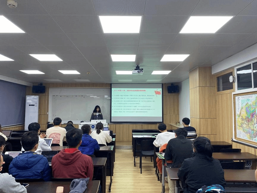 12月3日下午,高君宇学生党支部在逸夫贰楼前开展了“山巍巍 水洄洄——李四光入党心路历程史料展”集体参观学习活动。李四光讲师团成员衣可心从“为国为民:一面旗帜”、“烽火岁月:初心”、“新中国成立:使命”、“科技自立自强:创新”四个部分,介绍了李四光先生的事迹,勉励学生党员们继承弘扬李四光先生的精神,努力学习知识,传承红色精神,为党和国家做出自己的贡献。
