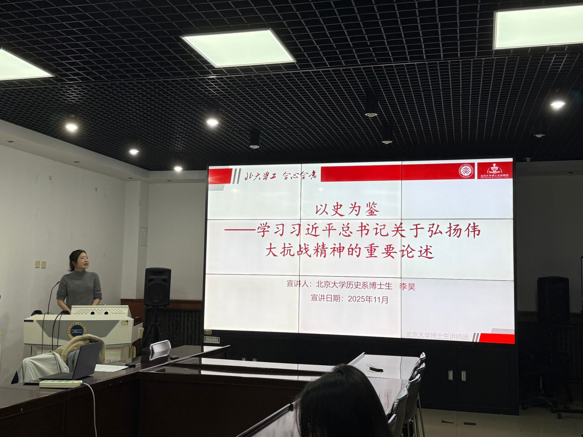 清华大学博士生讲师团讲师信树辰同志以亲历“九三”志愿服务为切入,围绕纪念抗战胜利80周年阐释“爱国情怀、民族气节、英雄气概、必胜信念”四维抗战精神,勉励青年“又红又专”,把论文写在祖国大地上,以“四个面向”攻关关键核心技术,在强国建设、民族复兴中砥砺担当、实干成才。
