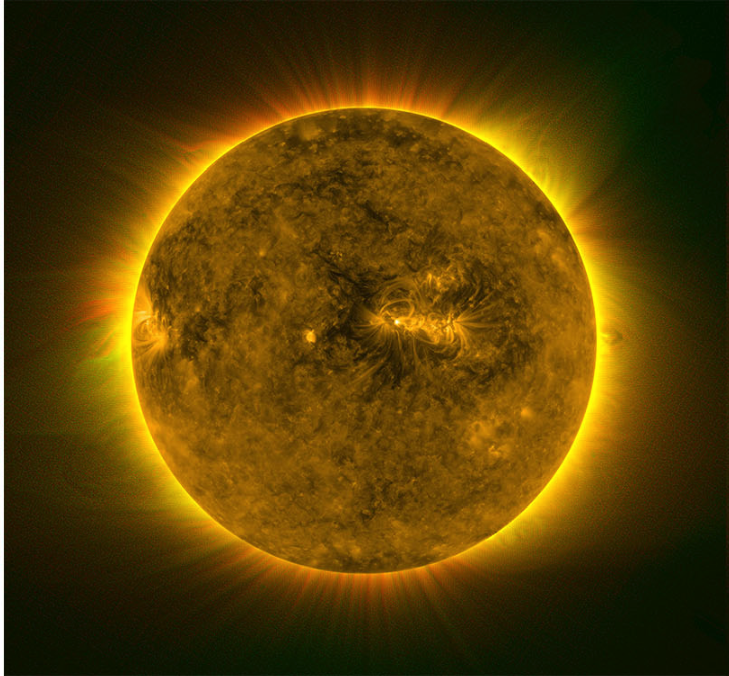 日冕是太阳的外层大气,最早是在日全食的时候被发现的。当月亮完全挡住太阳的盘面,微弱的日冕辐射就能够被地球上的人们所观测到。上世纪中叶,人们通过日全食的观测发现日冕中存在高次电离的铁离子,如Fe9+、Fe13+等,从而推断日冕的温度高达百万度,比太阳表面(光球)的温度高两个数量级以上。由于太阳向外辐射的能量来自太阳内部核心区域的核聚变反应,按照热力学第二定律,离太阳核心越远温度应该越低。打个比方,当人们烤火时,离火越远,温度越低。从太阳核心往外到光球层,这个规律确实是满足的,温度从约1500万度下降到5700度。然而从光球往外,温度却反常升高,到日冕甚至达到百万度的量级。如此高温的日冕是如何产生和维持的?这就是日冕加热的问题,它是太阳物理和空间物理领域长期以来未能解决的难题之一,并于2012年被Science杂志选为当代天文学的八大未解之谜之一。