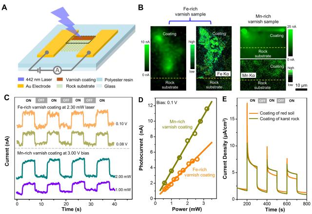 通过应用微区与原位光电测试手段,直接测定天然“矿物膜”半导体光电效应,已获得“矿物膜”与基岩高分辨率(微米)光电流信号面分布结果。发现富铁锰“矿物膜”区域表现出显著的光电流信号,而无铁锰元素富集的基岩不产生光电流响应(图1)。揭示出天然“矿物膜”具有稳定、灵敏的日光光子—光电子转换能力,获得其在一定波长下具有恒定光电转化效率(IPCE)的新认识,证实地球陆地上无机矿物也是太阳光能量吸收与转化的一类重要物质。