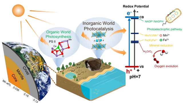 地球陆地上有机生物和无机矿物共同暴露在阳光下。众所周知的是,数十亿年来有机生物进化出复杂而精巧的胞内光合作用系统,可将太阳能转化为生物化学能,这一机制已得到深刻认识与广泛利用。然而,在自然界尚未观察到非生物的太阳光收集与利用系统,即暴露在太阳光下地球表面广泛分布的天然矿物,其长期受到太阳光辐射的响应机制,一直未被认识与利用。