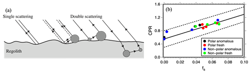 图3. (a) 月表雷达散射模型, (b) CPR随石块丰度的变化 (Fa and Cai, 2013)