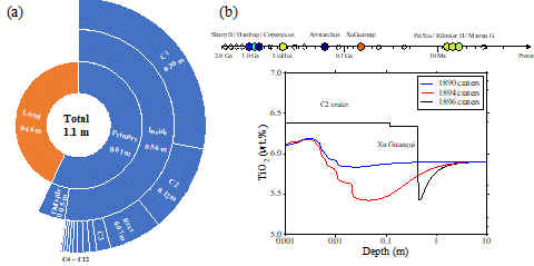 图3溅射沉积物组成与混合:(a)源撞击坑溅射物贡献比例分布;(b)溅射物沉积序列模型所预测的钛丰度剖面