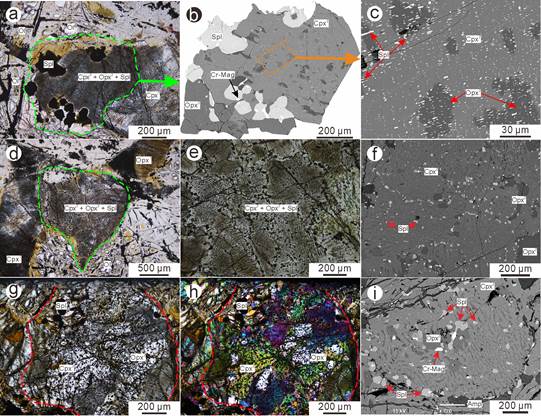 图1:(a),冀东太古宙橄榄岩中石榴石假象。(b)-(c),(a)中石榴石假象局部放大图。(d),石榴石假象与出溶的辉石伴生。(e)- (f),石榴石降压分解形成的辉石和尖晶石蠕虫状交生矿物组合。(g)-(i),石榴石假象被橄榄石包围,呈粒状变晶结构。