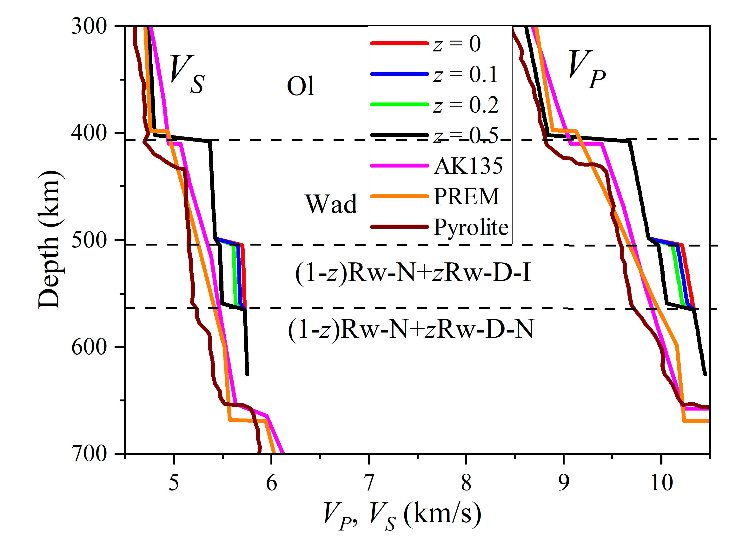 处于520-660 km深度的地幔过渡带下部主要由林伍德石(~56%)及超硅石榴石(~36-44%)组成。毛钙硅石含量较少,其比率由560 km左右的0%缓慢增长至660 km左右的~5%(图1中)。由于量少,且连续从超硅石榴石出溶,毛钙硅石的存在很难解释尖锐的地震波不连续面。相对应地,林伍德石占比最大,并具有离子可互换位置的尖晶石型结构,它更可能与560 km地震波不连续面的成因有关。然而,传统观点认为,林伍德石为正尖晶石型结构(所有Mg (Fe)离子占据八面体位置、所有Si离子占据四面体位置),其离子互换位置的几率接近零,林伍德石可能与560 km地震波不连续面无关。但近年来,性爱影片